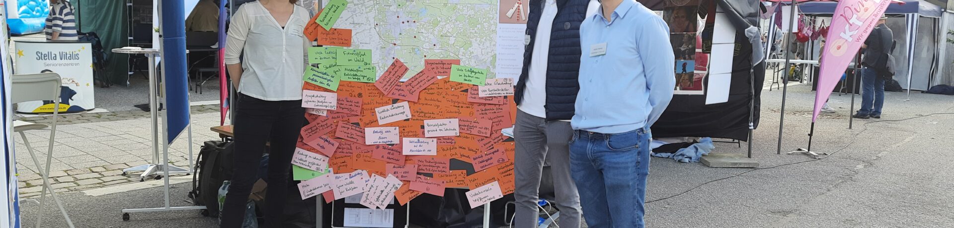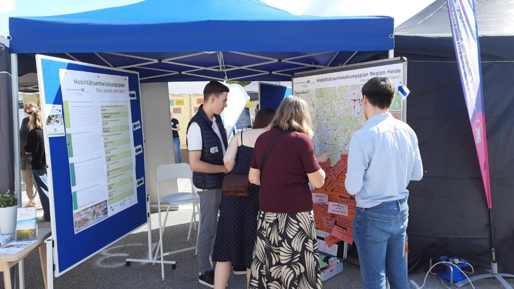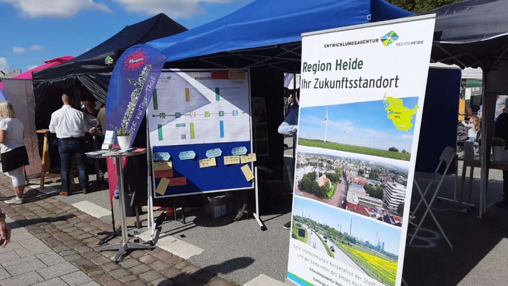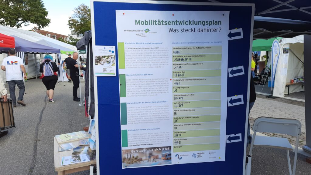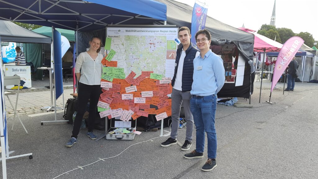Parallel zur laufenden Online-Beteiligung der Bevölkerung waren unsere Kolleg*innen Julia Höhnel und Maximilian Kloß auf dem Dithmarschen-Tag in Heide zu Gast. Dort haben wir an einem Stand der Entwicklungsagentur Region Heide über die Inhalte und den Zeitplan des Mobilitätsentwicklungsplans für die Region Heide informiert. Bereits bis zum Mittag war unsere mitgebrachte Karte gut gefüllt mit Lob, aber vor allem mit vielen Verbesserungsvorschlägen. Am Nachmittag kamen wir mit dem Notieren von Hinweisen kaum hinterher und die Stellwand platzte aus ihren Nähten. Die Zettel waren am Ende mindestens in 3 Lagen übereinander angepinnt.
